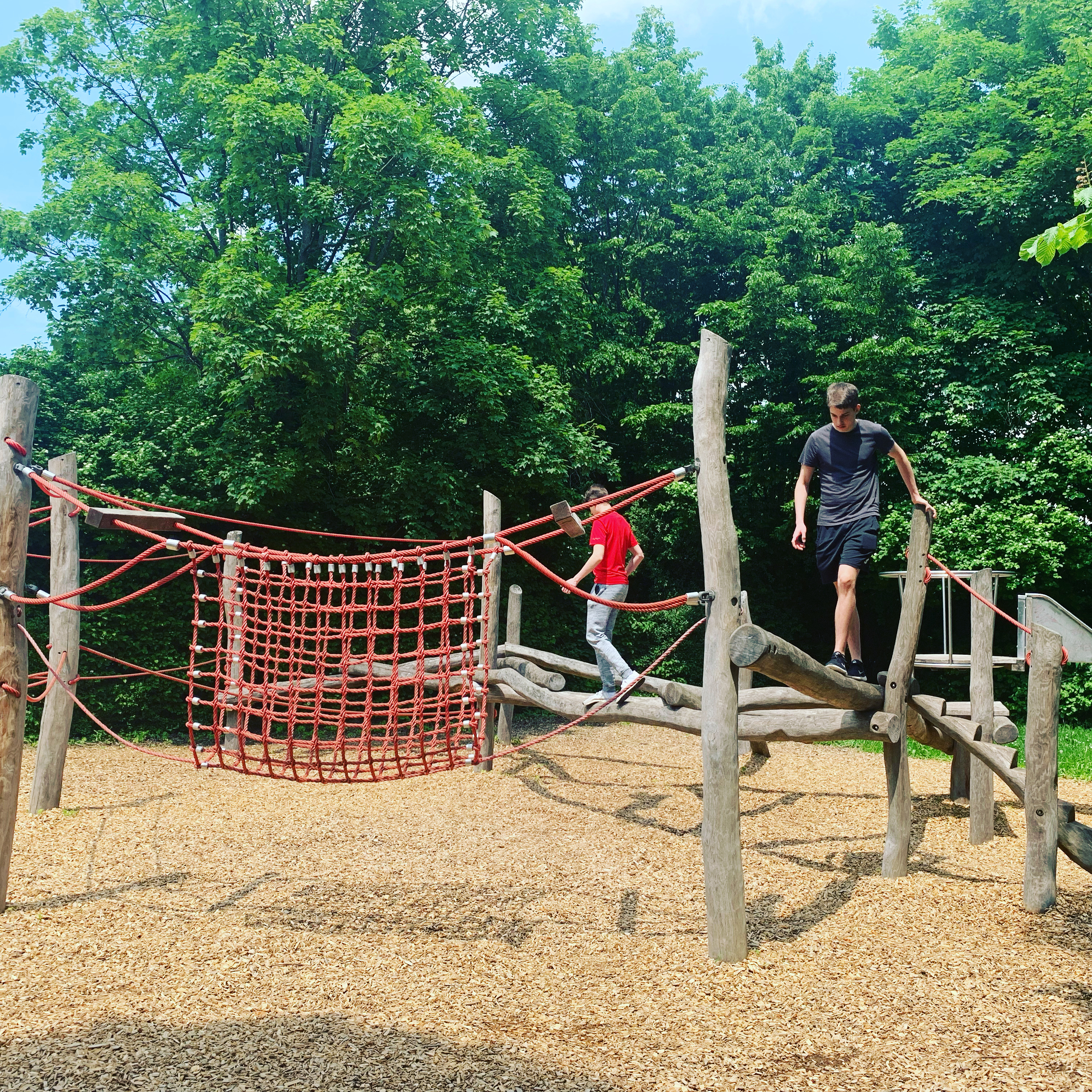 In addition to the lake, there are shops, bakeries, biergartens, salons, and fitness centers. We stumbled across a flower vending machine near a cemetery (genius!). And the boys are blown away by all the playgrounds scattered about. Even though they’re 16, they couldn’t resist this rope park and marveled at how something like this would never fly in the US.