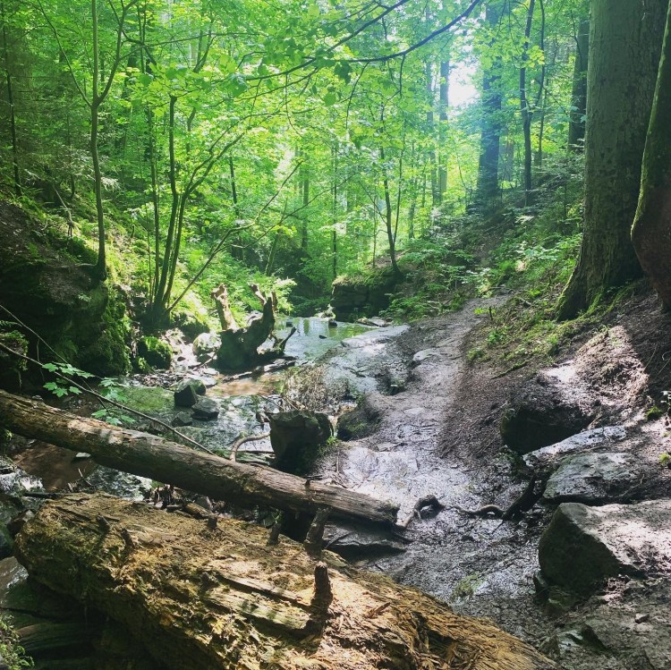 After driving into Stuttgart on Saturday to snag a deal on an iron and hair dryers from a departing military family, we were craving time in nature. It was a hot, hot weekend and our hope was that the canopy of the trees in the Black Forest would provide a nice respite from the blazing sun. So we packed up the kids and the dog and headed out west to the village of Calw. From there, we were searching for a hike my new friend Helen had told us about – Xanderklinge. It’s on the Northern edge of the Black Forest and features three waterfalls.